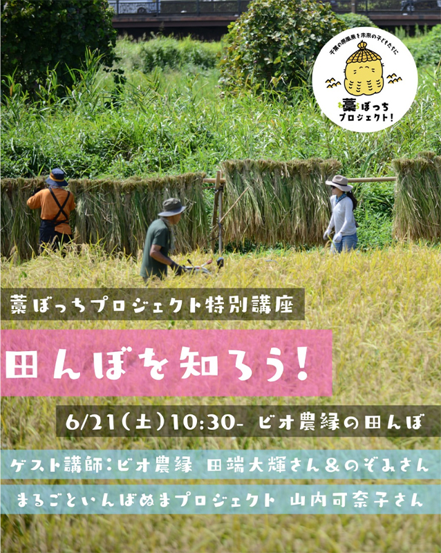 藁ぼっちプロジェクトでは、もっと皆さんに田んぼを知って、親しんでもらうため、お米農家のビオ農縁さんと、まるごといんばぬまプロジェクト・山内可奈子さんをお招きして、お米づくりと、田んぼの生き物のお話を伺うイベントを開催します。